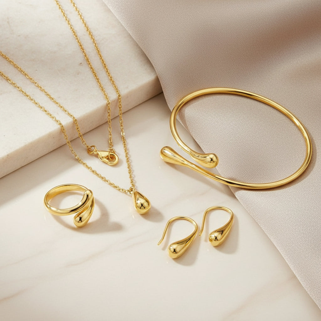 Cet ensemble quatre pièces vous permet de créer un look coordonné parfait. Le motif goutte d'eau apporte une touche de délicatesse et de féminité, tandis que l'argent 925 garantit qualité et durabilité. Portez l'ensemble complet pour les grandes occasions ou mixez les pièces selon vos envies.