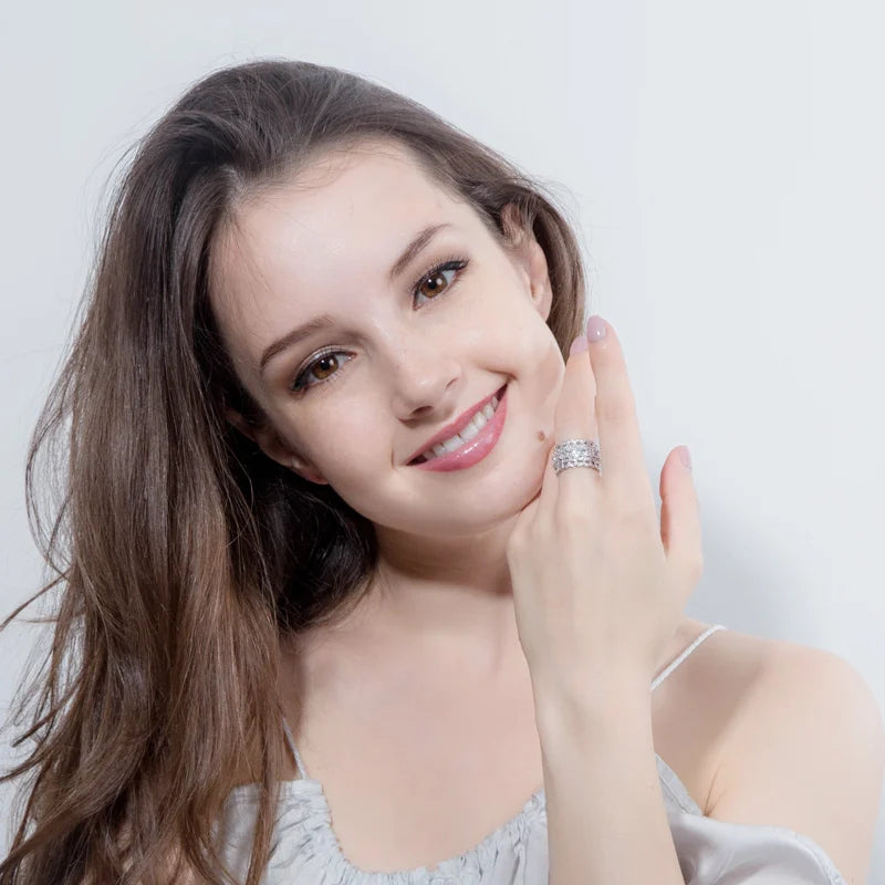 Cette bague allie le glamour hollywoodien au raffinement contemporain. Sa pierre ovale centrale capte la lumière sous tous les angles, créant un jeu d'éclat fascinant. Le design large apporte une présence affirmée et élégante à votre main.